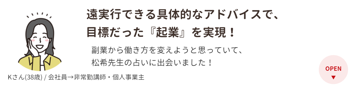 いただいたアドバイス等を実践していたところ、初めての鑑定から1年経たない内に、会社員を辞めて、目標だった起業をすることが出来ました!