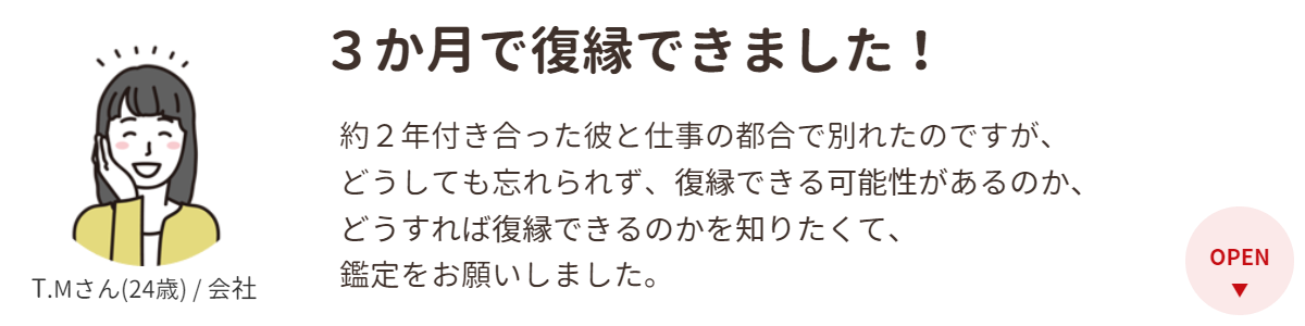 姓名判断は初めてでしたが、松希先生は私と彼の相性や性格の特徴なども見てくれて、復縁できると背中を押してくれました。