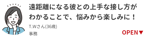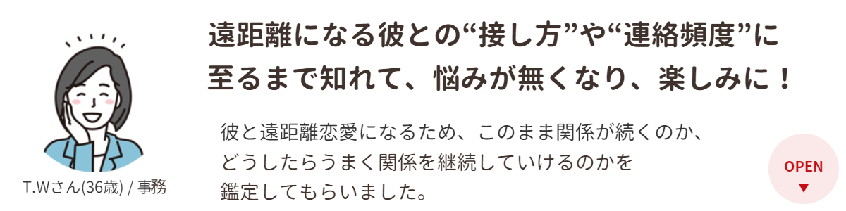 以前は彼から少し連絡がないだけで不安でしたが、鑑定を受けてから自分に自信が持てたことで気持ちに余裕ができ、良い精神状態でお付き合いが出来ています。