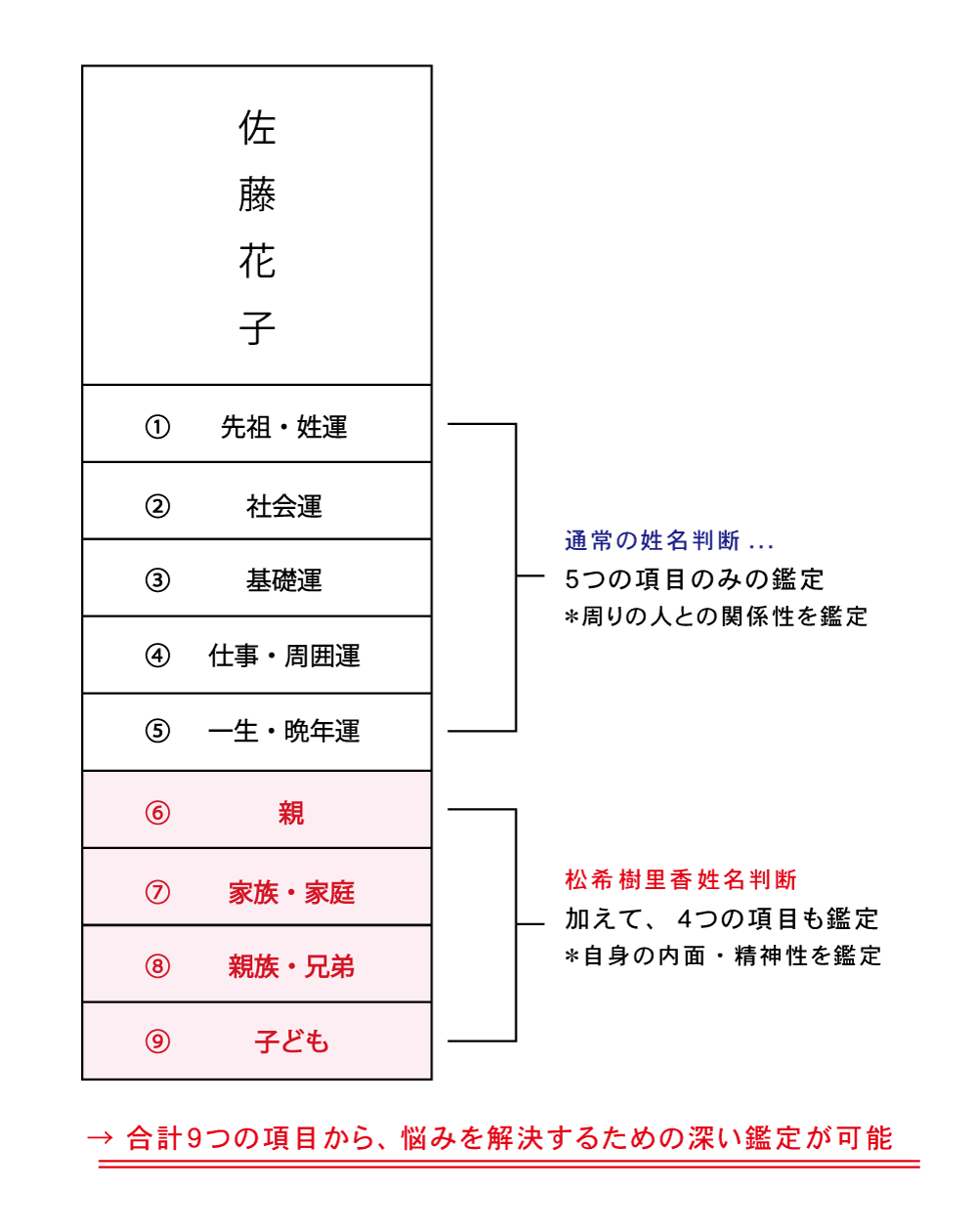 他の姓名判断鑑定士は社会運など5つの項目しか鑑定してくれません。しかし、松希 樹里香 姓名判断鑑定では、9つも算出するため、お名前に隠された個性や特徴など、あなたの内面まで深く鑑定をいたします。