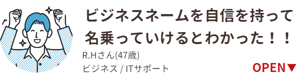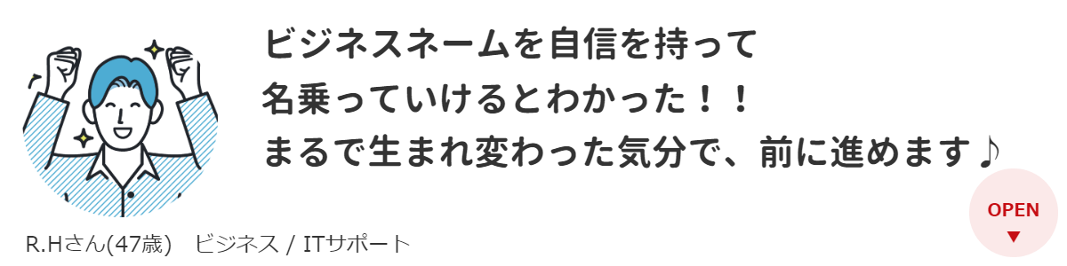 また、鑑定をしていただく中で、私の質問に対しての回答が具体例交えてわかりやすかったですし、回答の引き出しが多い印象を受けました。その鑑定を受けて、ビジネスネームの作成もしていただきましたが、名前を変えた後、思わぬところから仕事に関する相談が複数!来るようになりました!